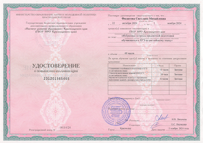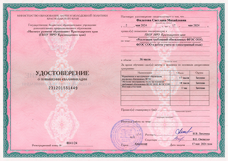 Повышение квалификации "Особенности и современные подходы преподавания английского языка в соответствии с ФГОС"